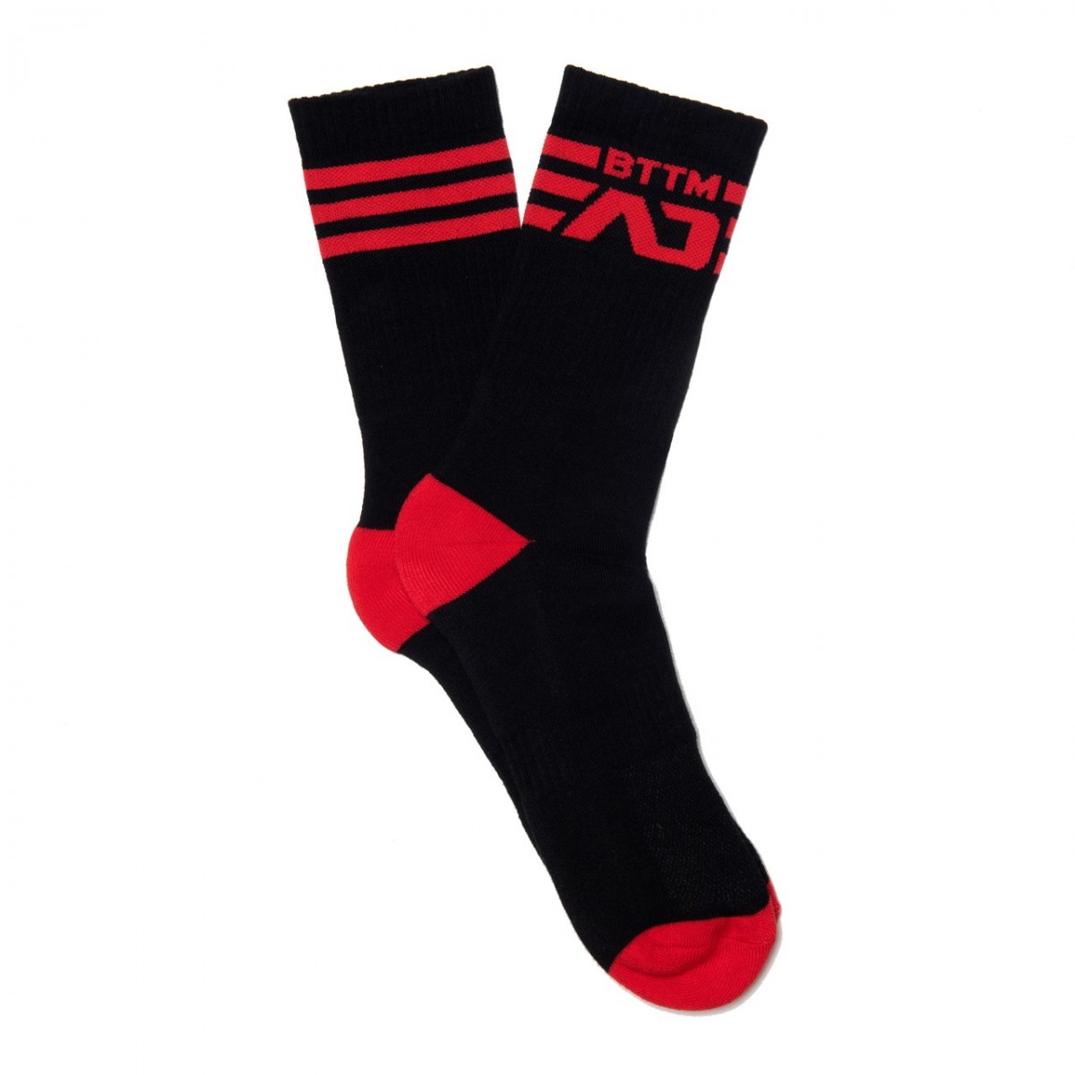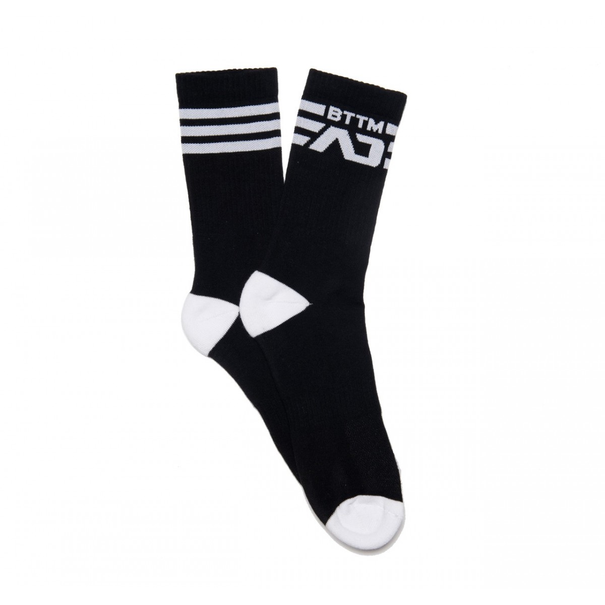 Socks made of 71% cotton, 14% elastane, 9% polyamide and 6% lycra. Horizontal stripes on the top and “BTTM” and AD logo on the external sides.