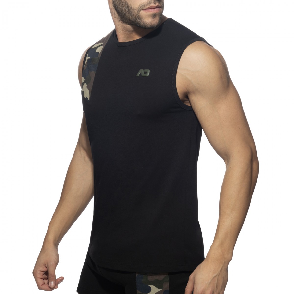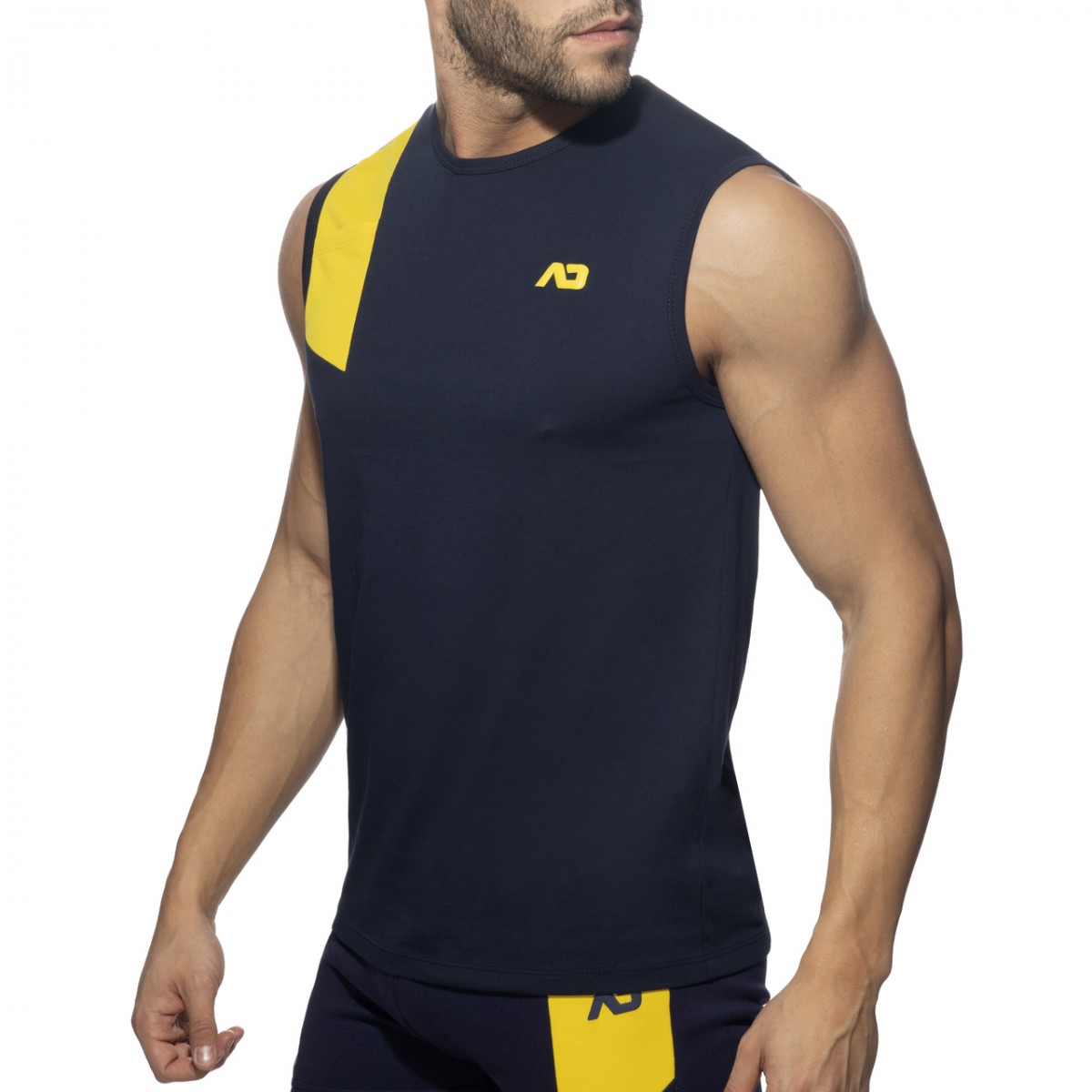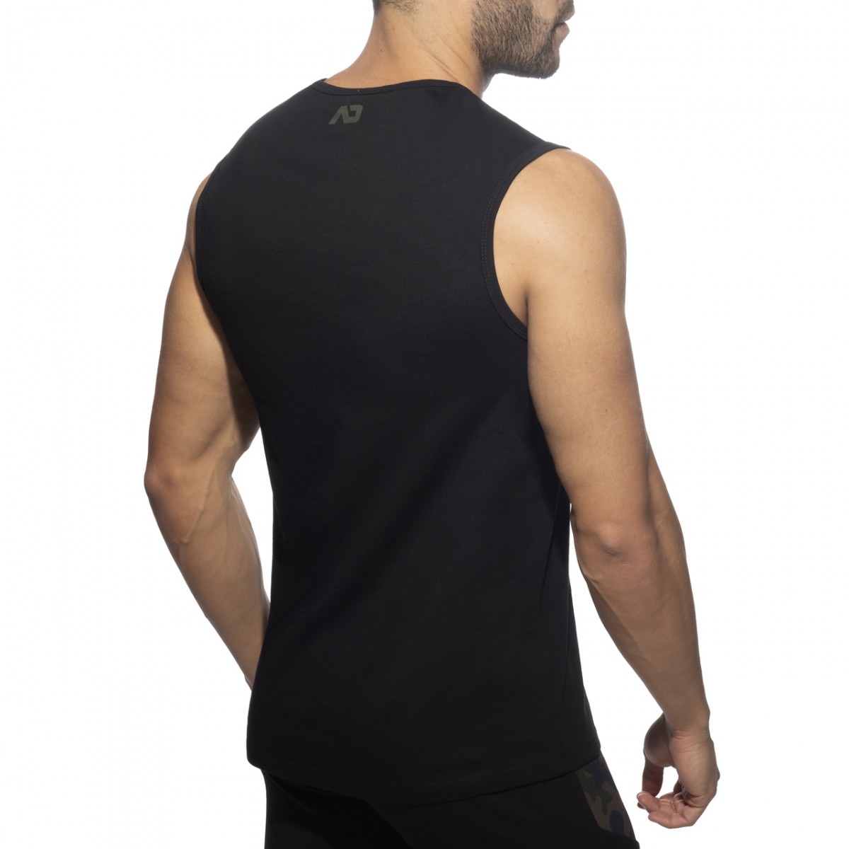Cotton tanktop made of finest fabrics: 90% Cotton – 10% Polyester. AD logo printed on the left chest and behind under the neck. Contrast patch on the right shoulder with little pocket.