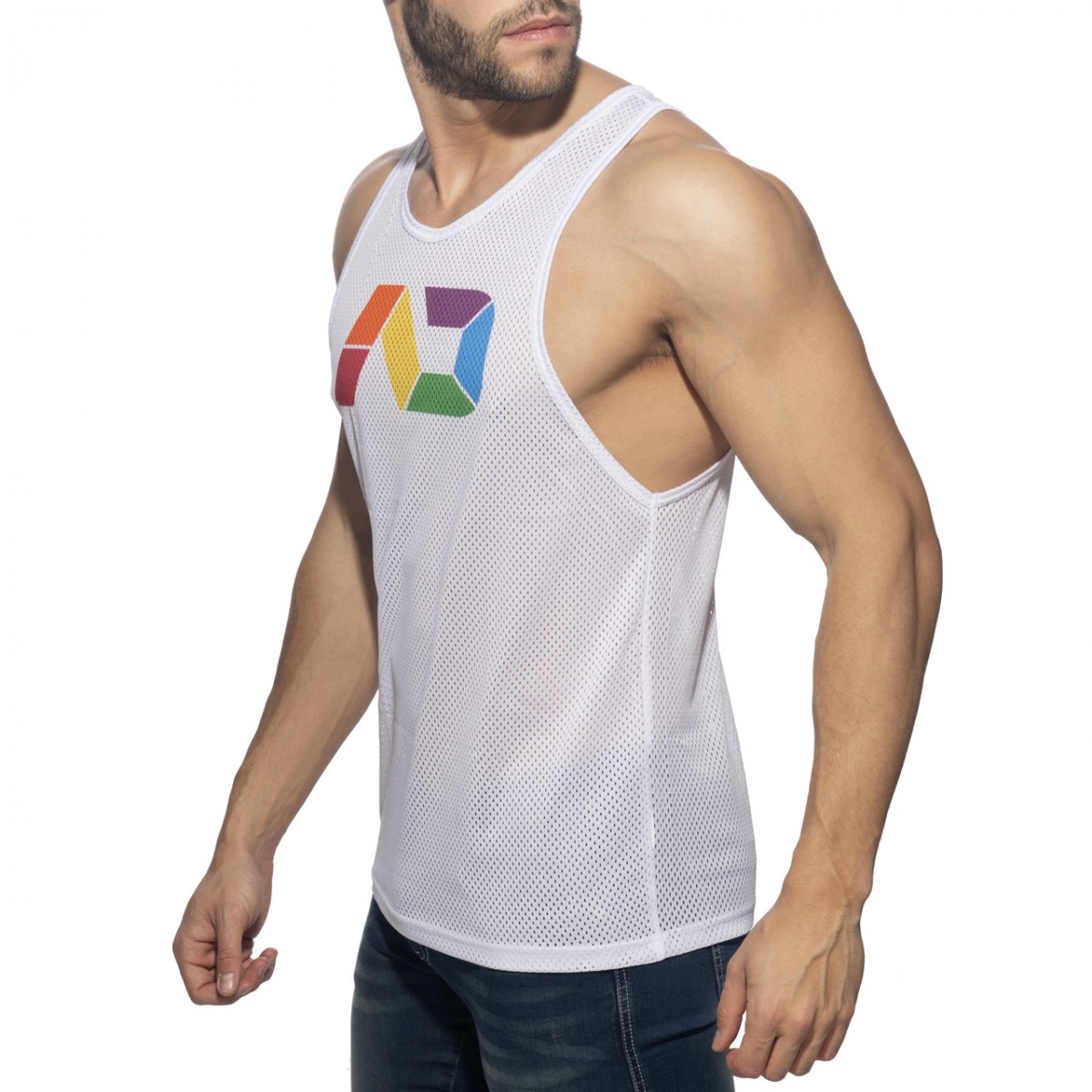 Tank top 100% polyester mesh. AD logo printed on front and AD silicone logo on the back.