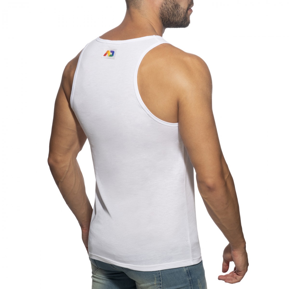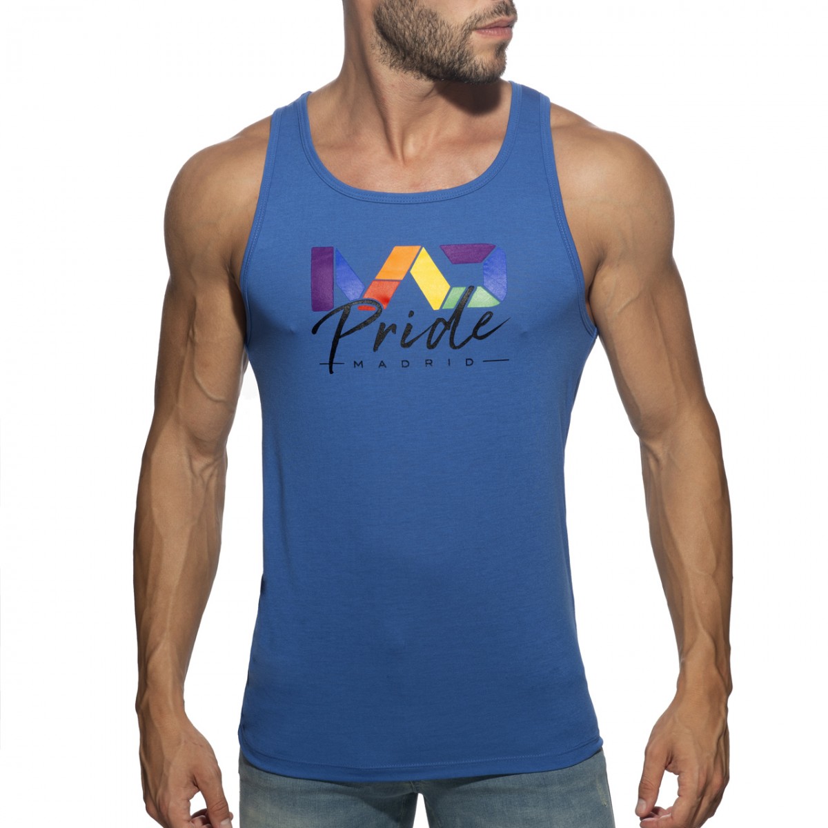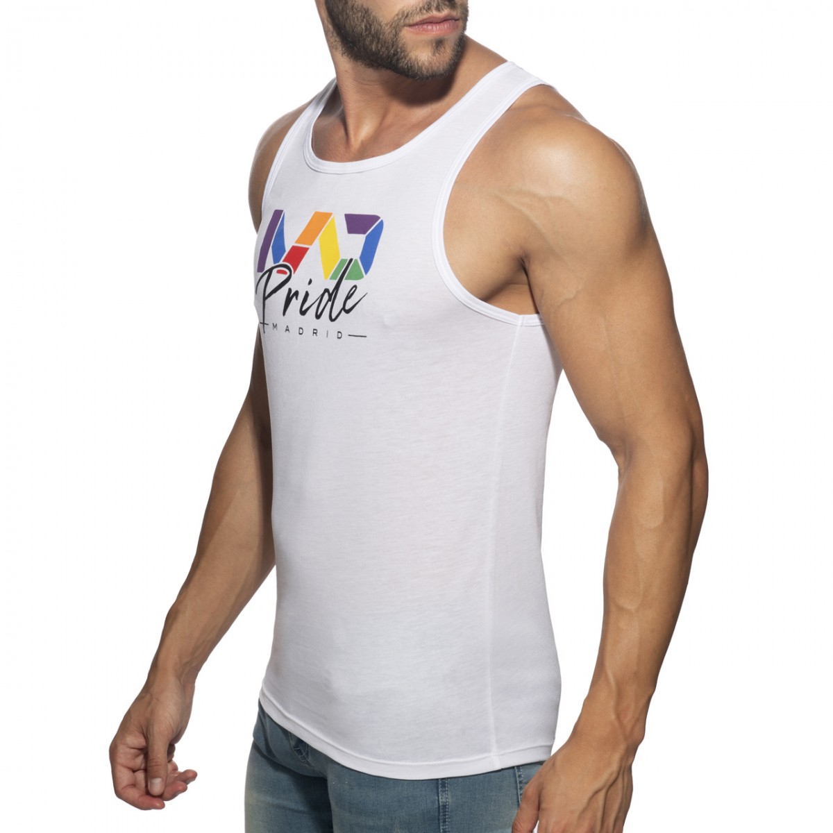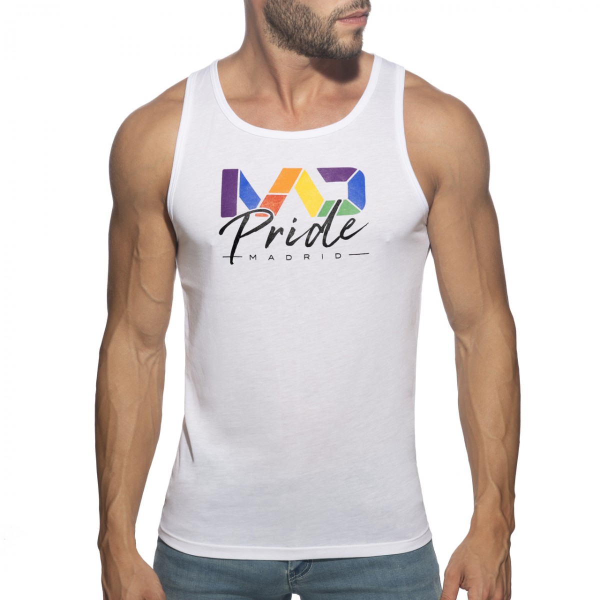 Light tanktop made of finest and fresh fabric. Composition: 50% Polyester – 50% Viscose. MAD in rainbow colors printed in the front. AD in rainbow colors silicon tag in the back side.
