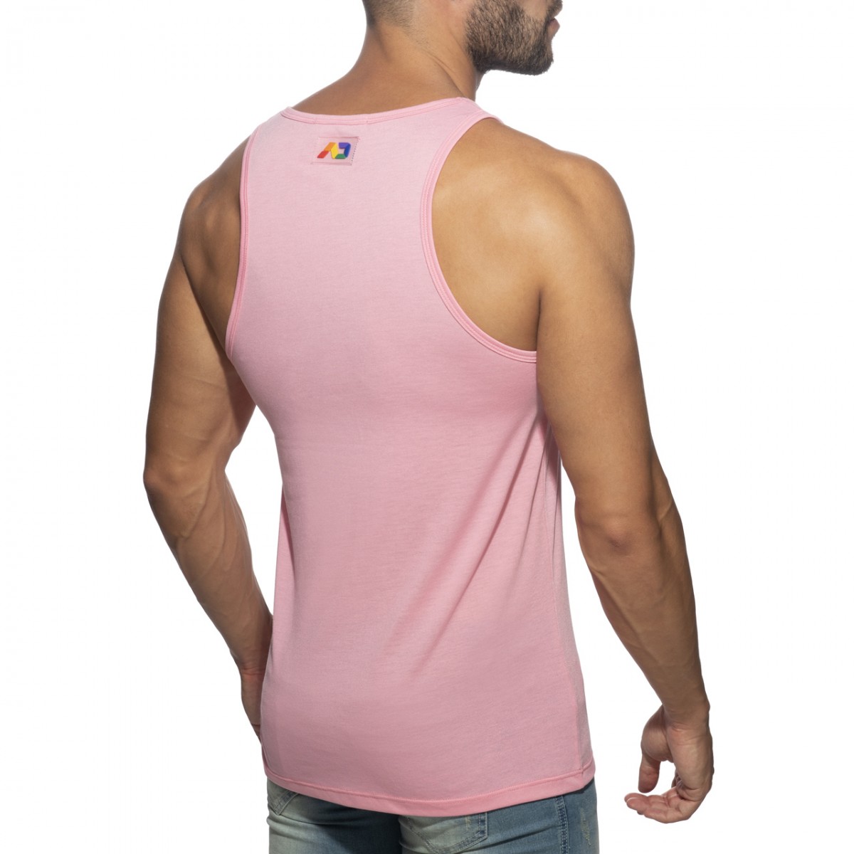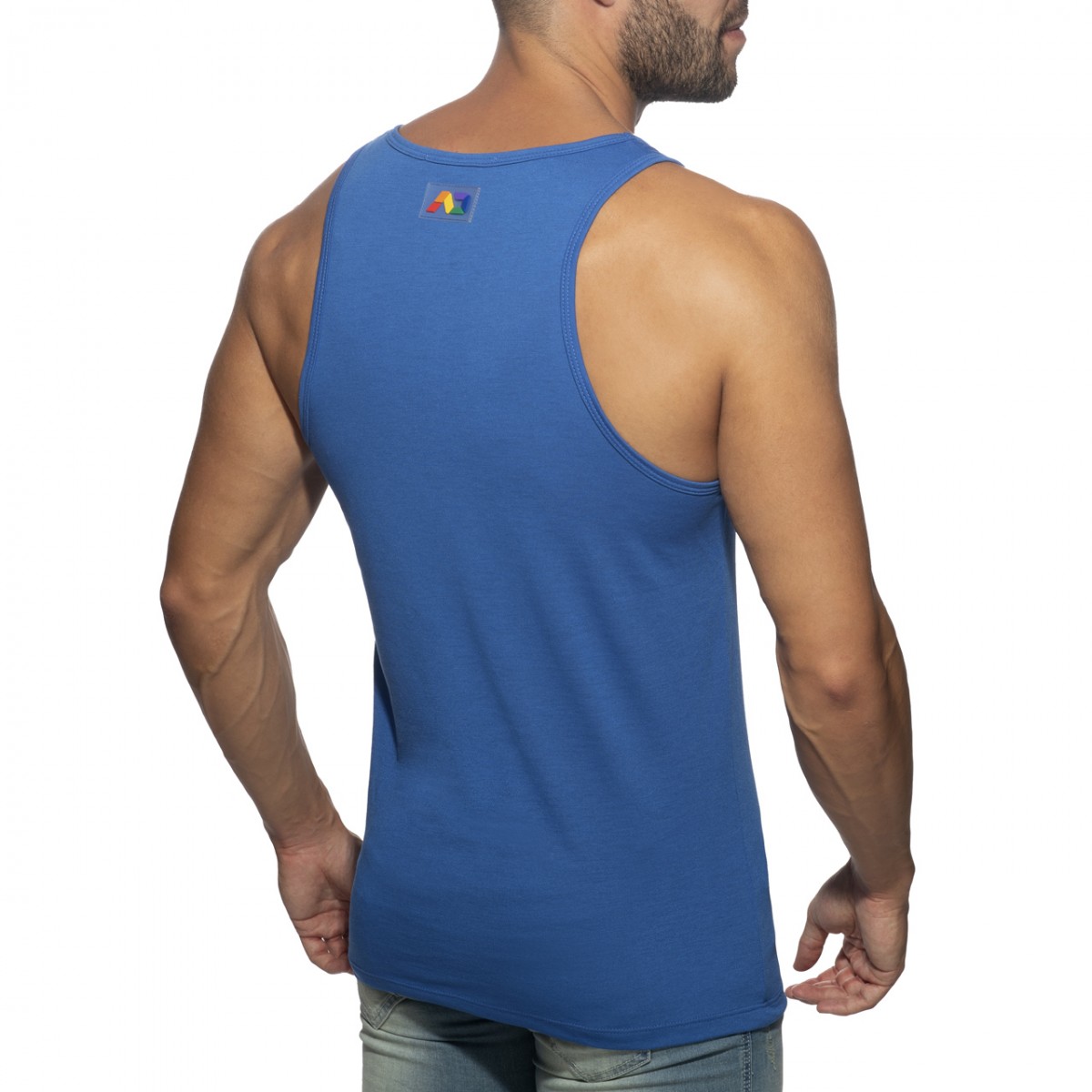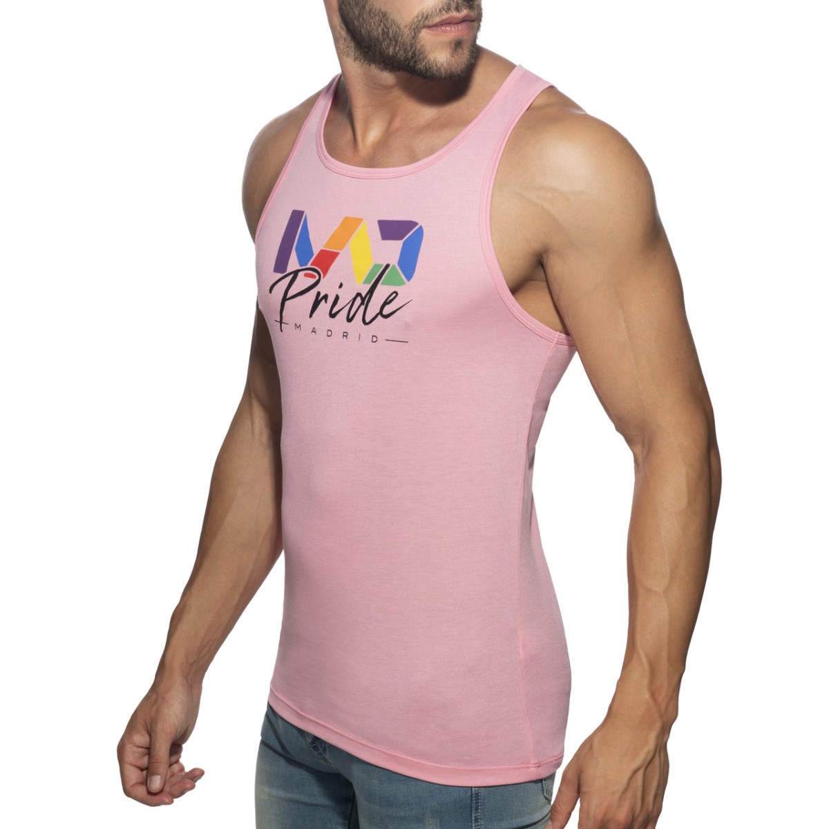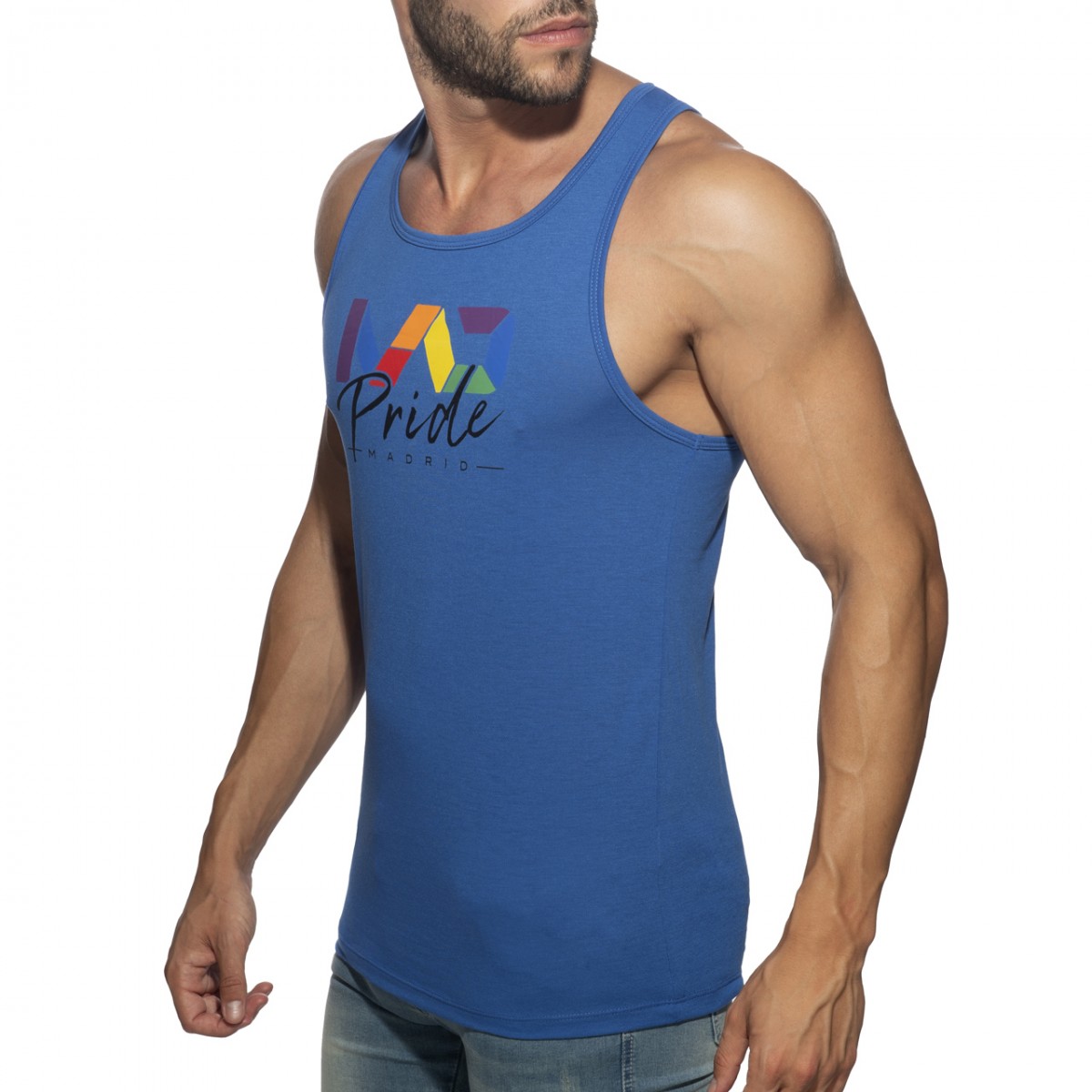 Light tanktop made of finest and fresh fabric. Composition: 50% Polyester – 50% Viscose. MAD in rainbow colors printed in the front. AD in rainbow colors silicon tag in the back side.