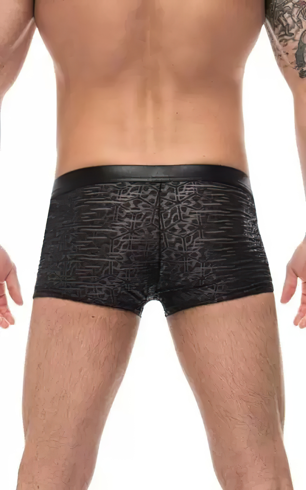 Male Power Zip Pouch Short features a diagonal pouch zipper with protective flap, contoured pouch, slimming wet look waistband. Lightweight and breathable with all way stretch.
