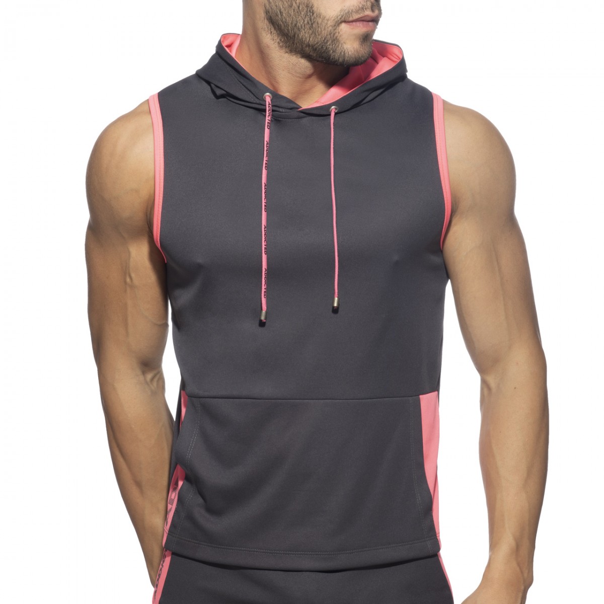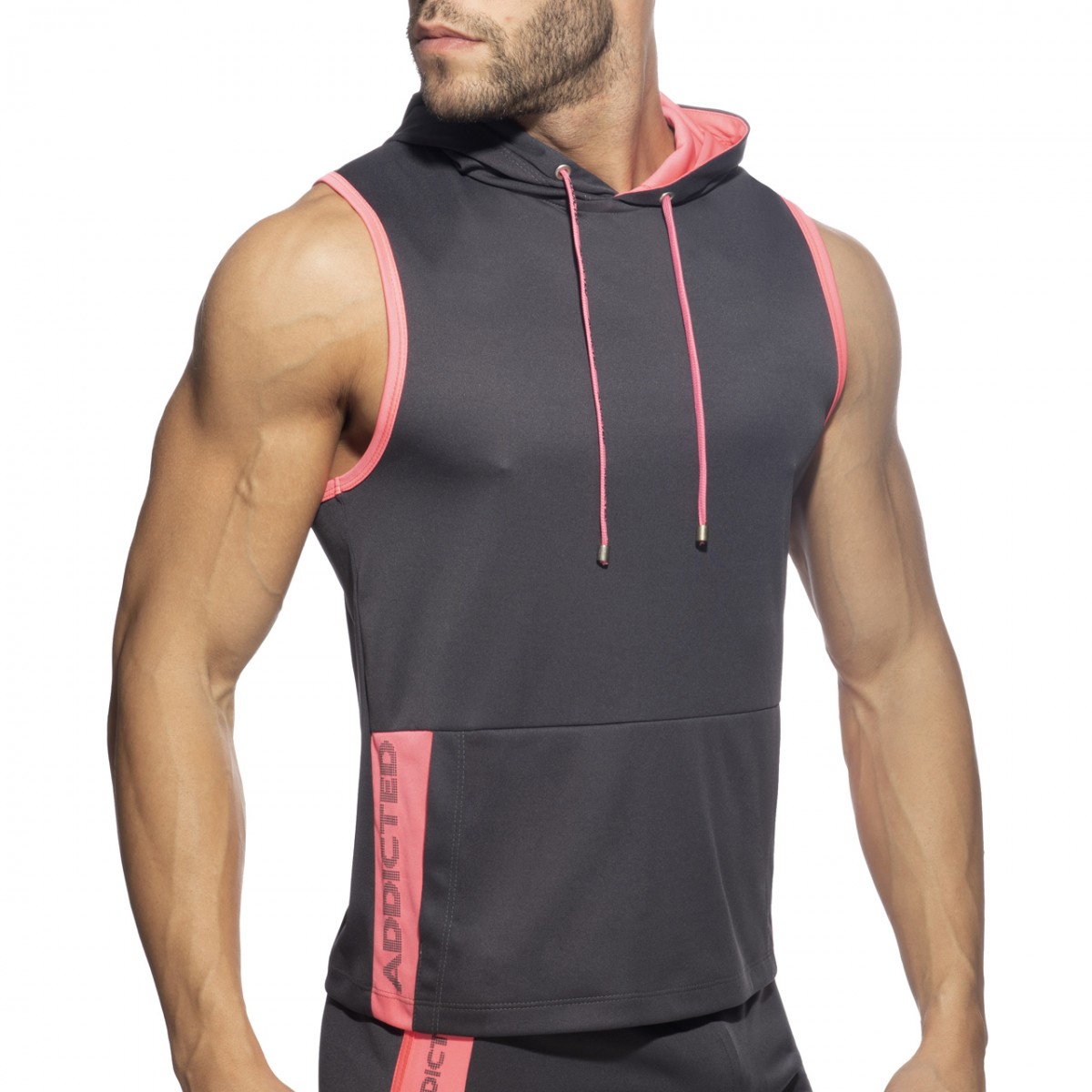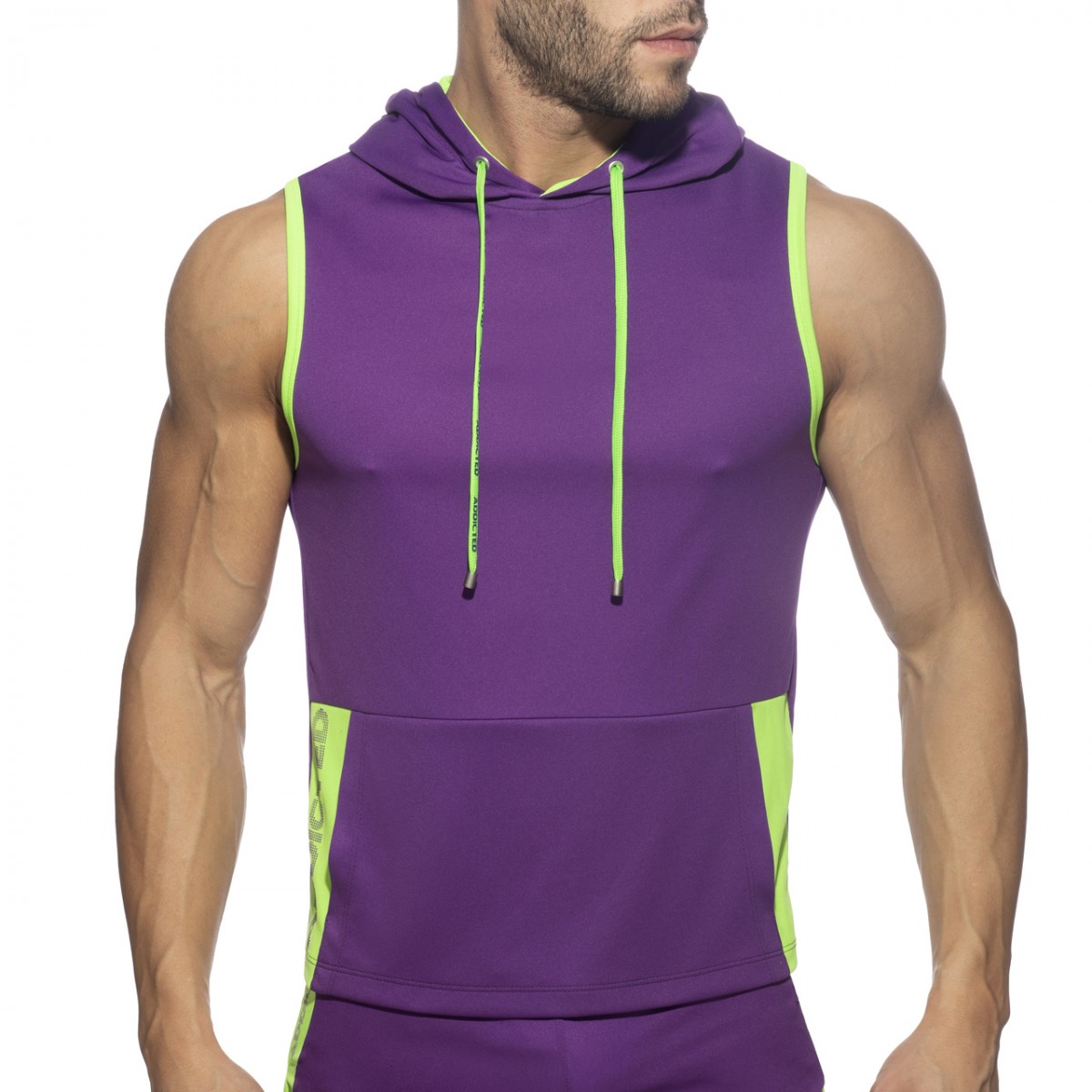 Sleeveless hoody made of polyester 100% fabric. Double front pocket and ADDICTED printed vertically on the right side. Contrast color on the lining of the hoody and the sides. Cords on the neck for best adjustment.