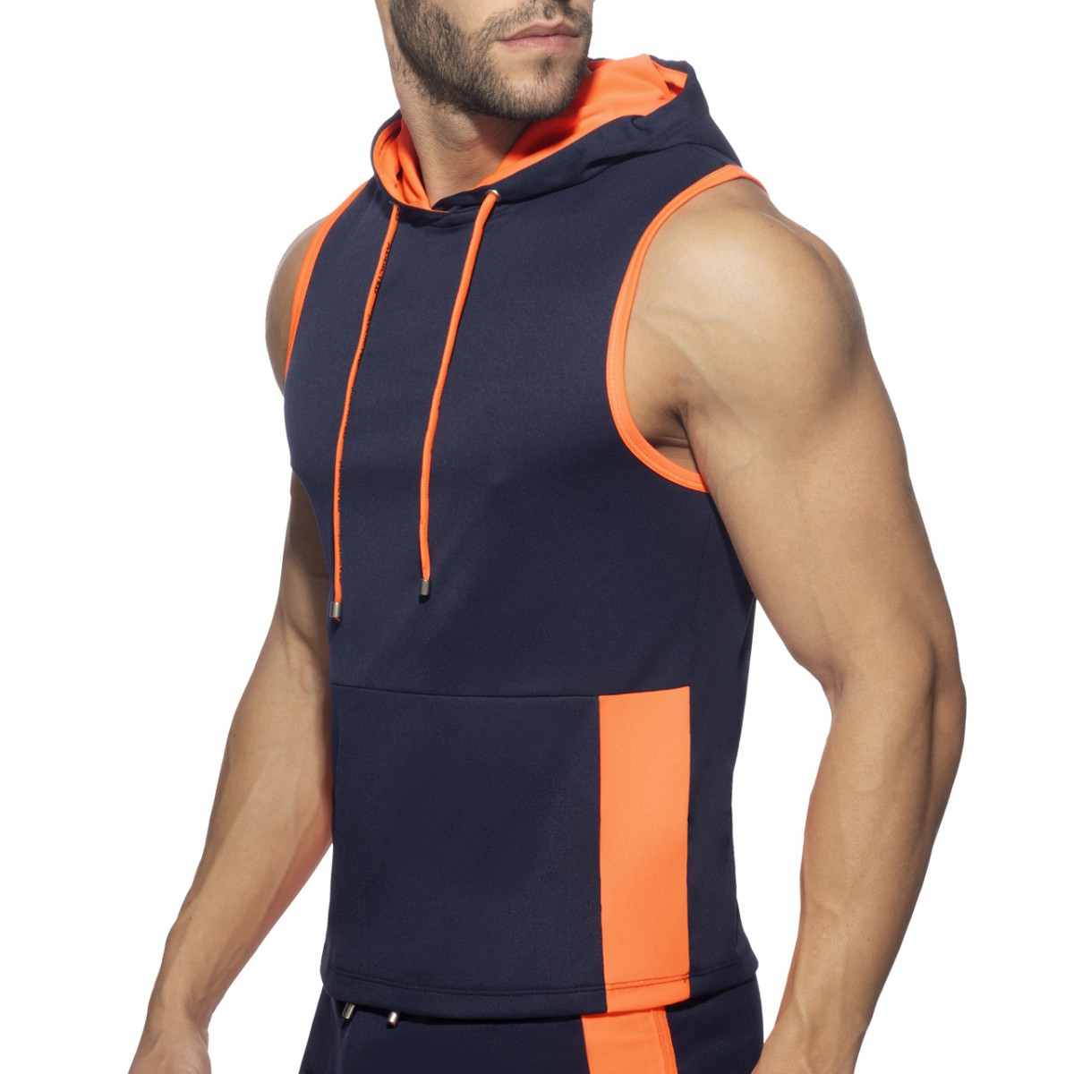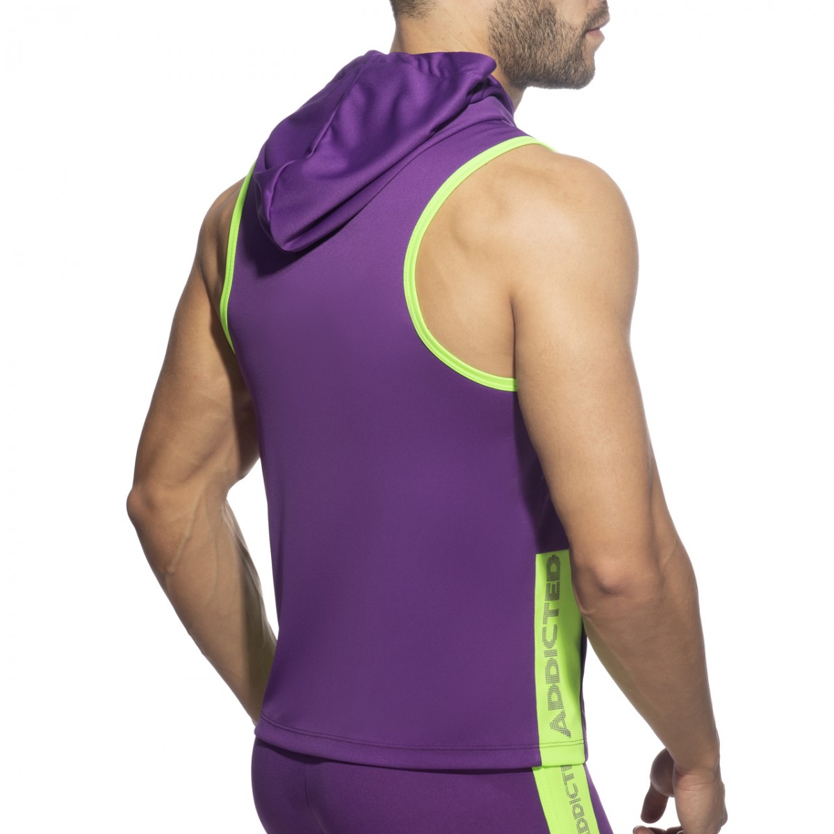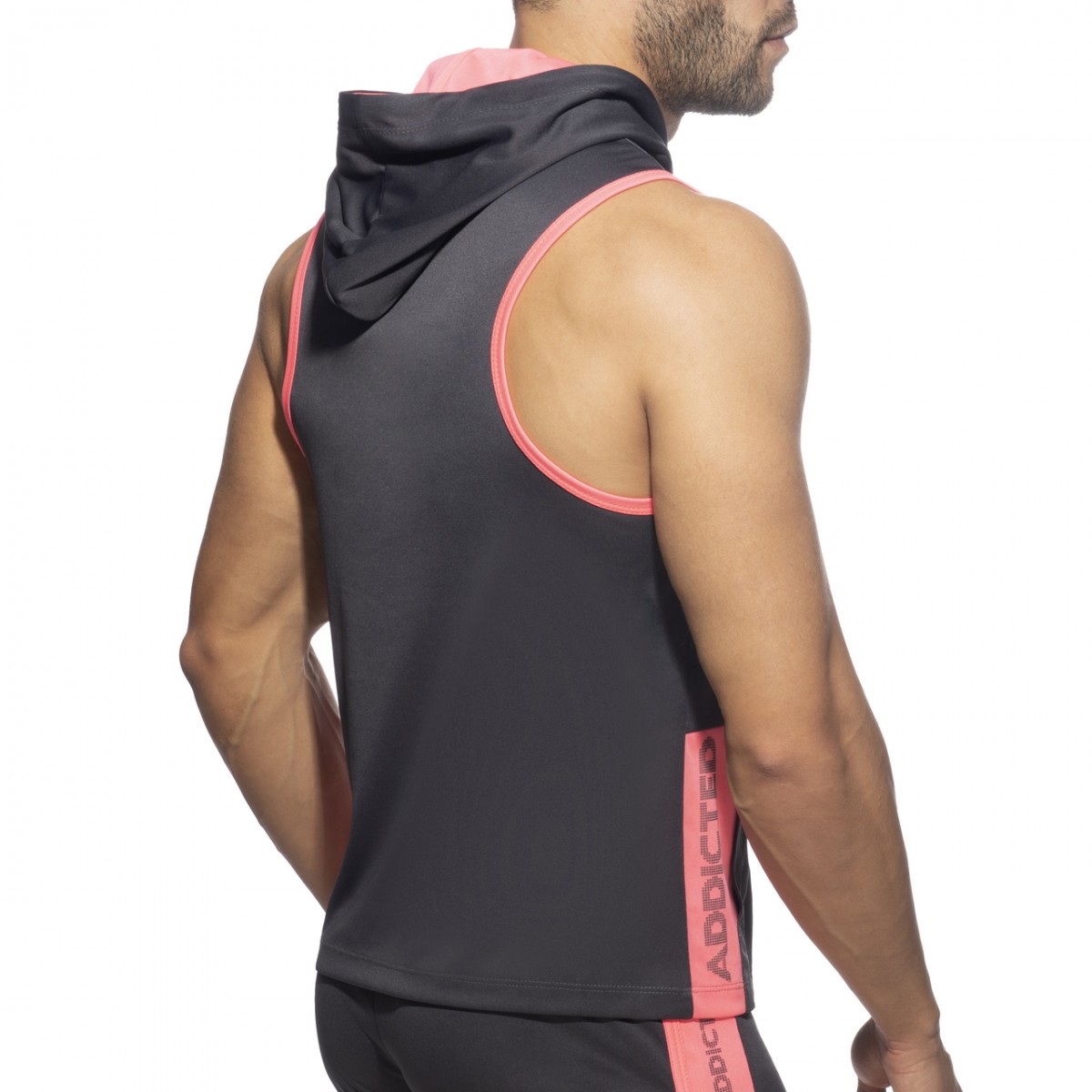 Sleeveless hoody made of polyester 100% fabric. Double front pocket and ADDICTED printed vertically on the right side. Contrast color on the lining of the hoody and the sides. Cords on the neck for best adjustment.