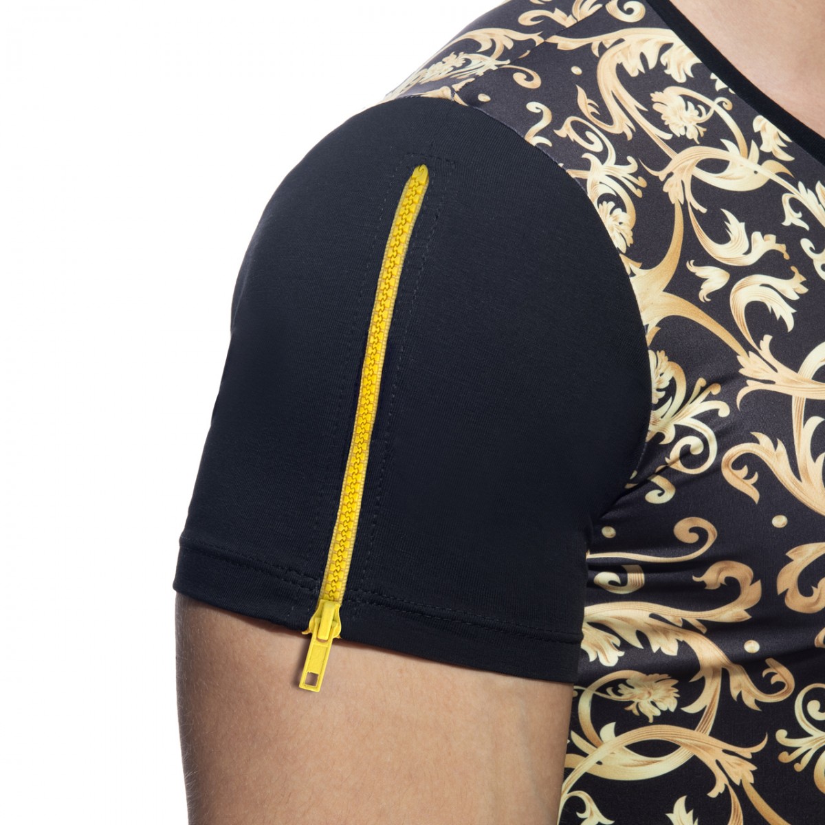 V-neck t-shirt made of finest printed fabric: 95% Polyester – 5% Cotton. Versailles golden print allover. Plain black sleeves. Metallic zip on the right sleeve. AD silicon logo on the left chest.