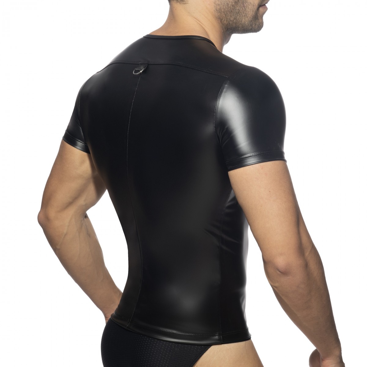 Fetish short sleeves open shirt made of rubber fabric. Composition: 95% Polyester – 5% Elastane. Rubber fabric with AD silicon logo over the left chest. Laminated fabric pretending to be latex. Metallic front zipper. Metallic hook in the back .